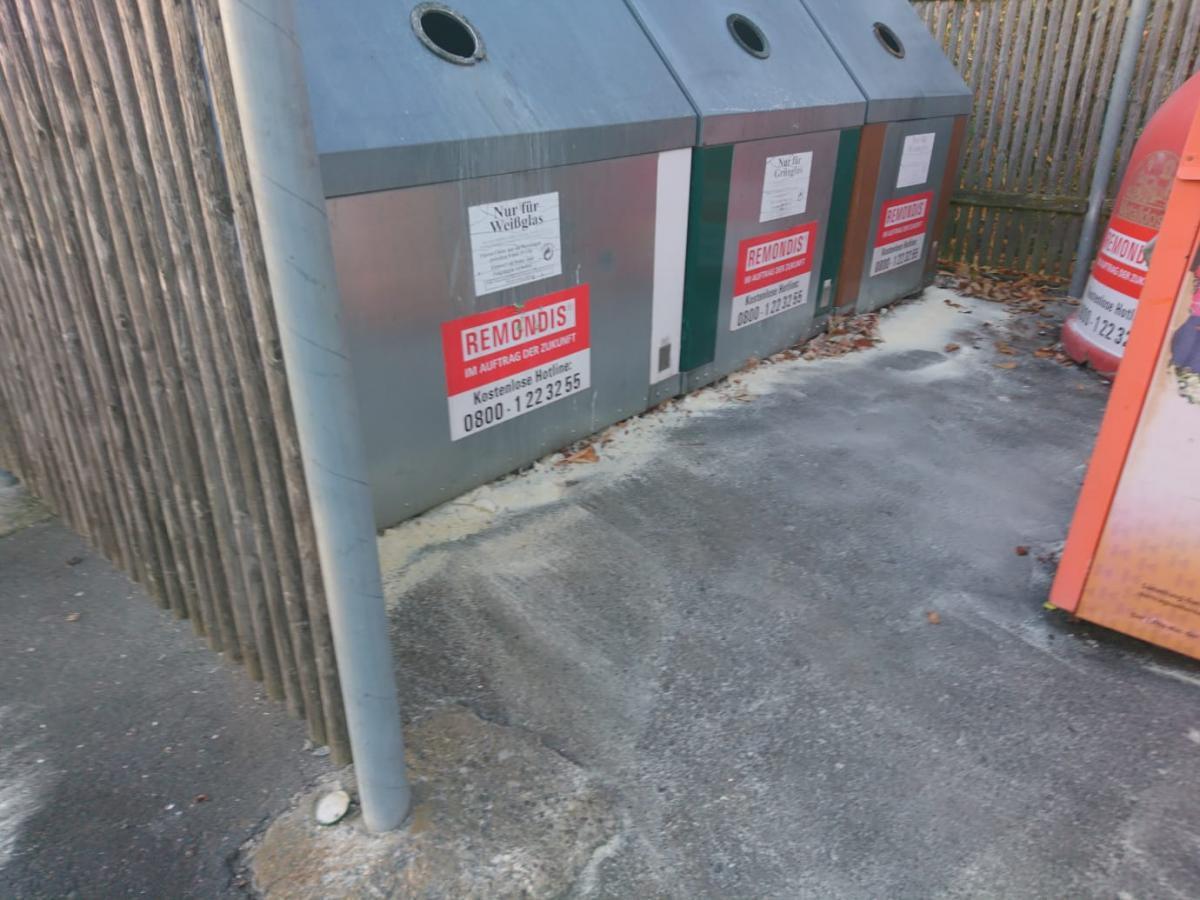 Ein Anwohner machte einen Feuerwehrkameraden darauf aufmerksam, dass eine ölähnliche Flüssigkeit aus den Glascontainern ausläuft. Dieser informierte die ILS Coburg, welche eine Polizeistreife vorbei schickte. Die Polizei lies die Feuerwehr zum Abbinden der Flüssigkeit alarmieren.